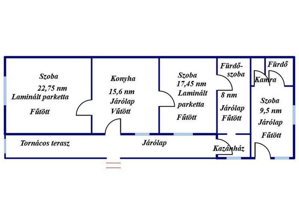 A fő lakrészben két szoba, konyha?étkező, fürdőszoba WC-vel, valamint háztartási/kazánhelyiség található.