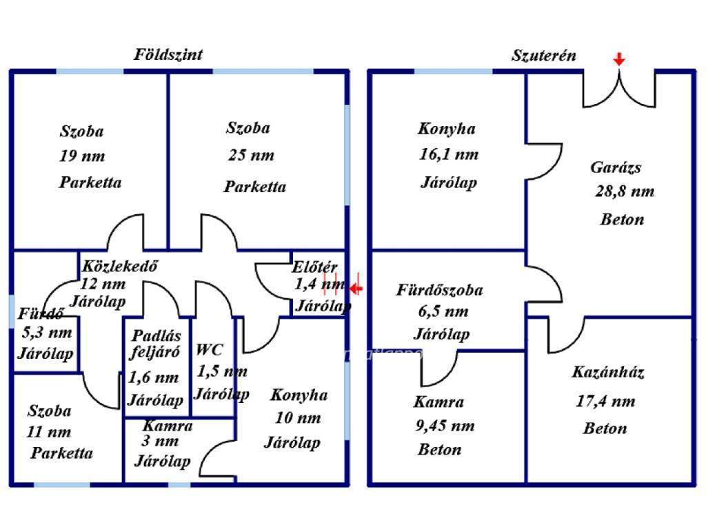 Az 1992-ben épült ingatlan földszintjén 2 nagyszoba, 1 félszoba, nagy előszoba, nagy étkező konyhával, nagy, felújított fürdőszoba, külön-bejáratú WC, kamra, az alsó szuterén szinten nagy garázs, nagy konyha, nagy fürdőszoba, nagy kamra, nagy kazánház kapott helyet, fűtéséről cirkó gázkazán és vegyes tüzelésű kazán, radiátoros központi fűtés segítségével egyaránt gondoskodik, szükség esetén kályhákkal is lehet fűteni.