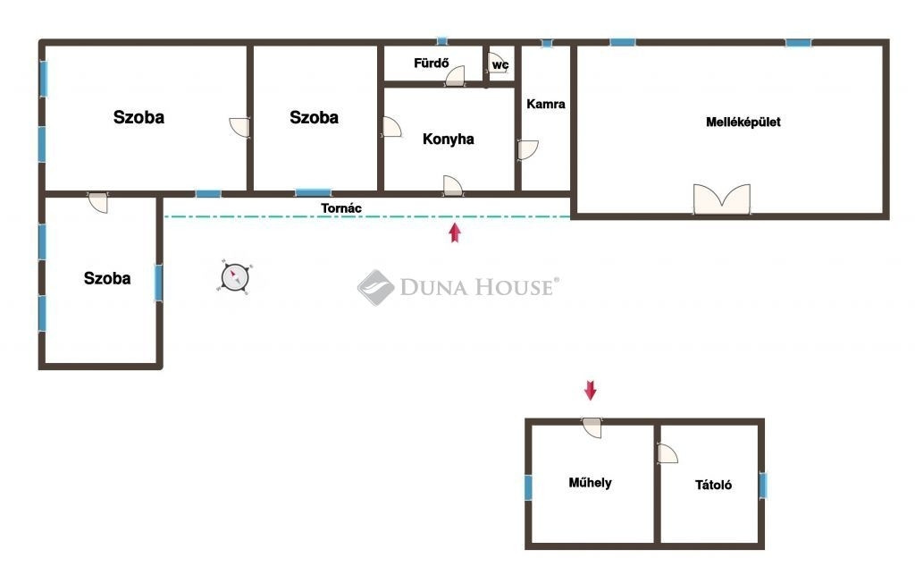 3 szoba, konyha, kamra, fürdő, wc, tornác, valamint egy külön bejáratú, 45 m²-es tárolásra alkalmas helyiség. Emellett egy pince is rendelkezésre áll.
