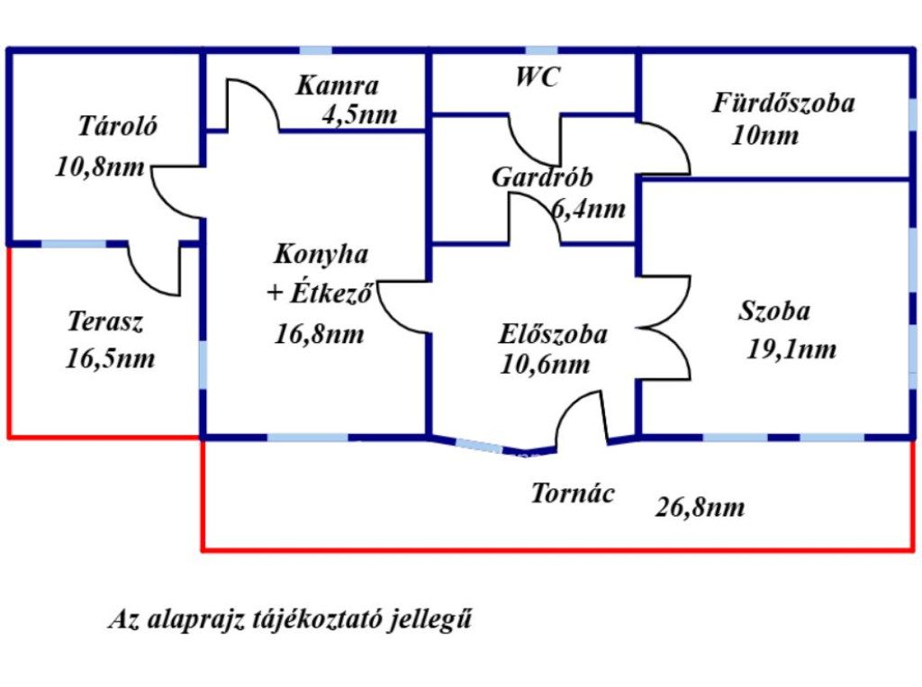 A belső elosztás logikus és tágas: külön szoba, amerikai konyhás nappali, kamra, gardrób és külön fürdőszoba és WC kapott helyet a tervekben.