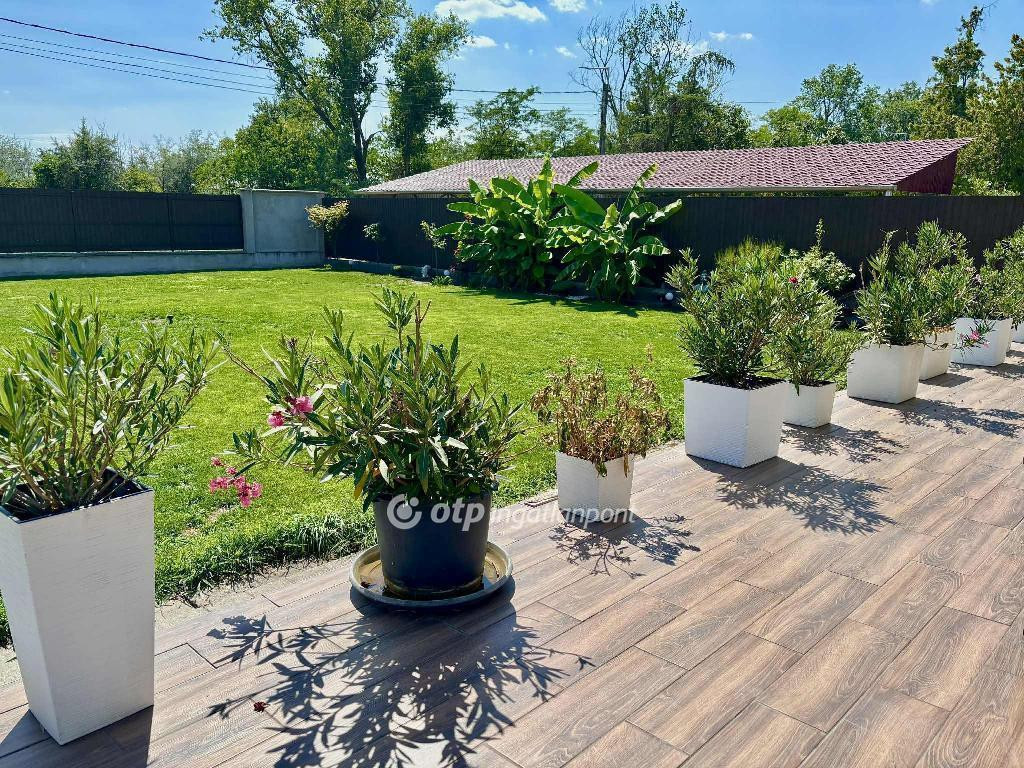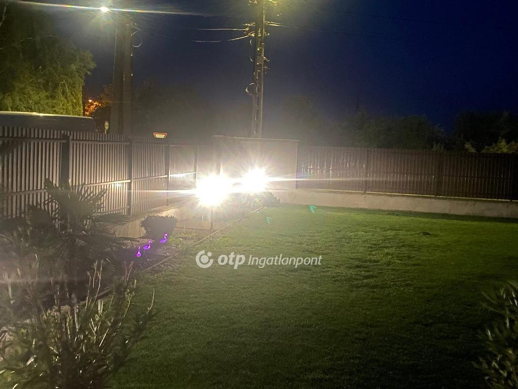 A telek 1045 nm, egyik felében nagy füves kertet találunk, a másik fele térköves. A parkosított kert víz-ellátását fúrott kút biztosítja. A bejáróból megközelíthető az aknával ellátott garázs, fedett kocsibeállók, valamint egy kis tároló-műhely is. Egy személyi- és két kocsibeállós kapun tudunk bejutni a telekre, mindegyik elektromos motorral felszerelt.