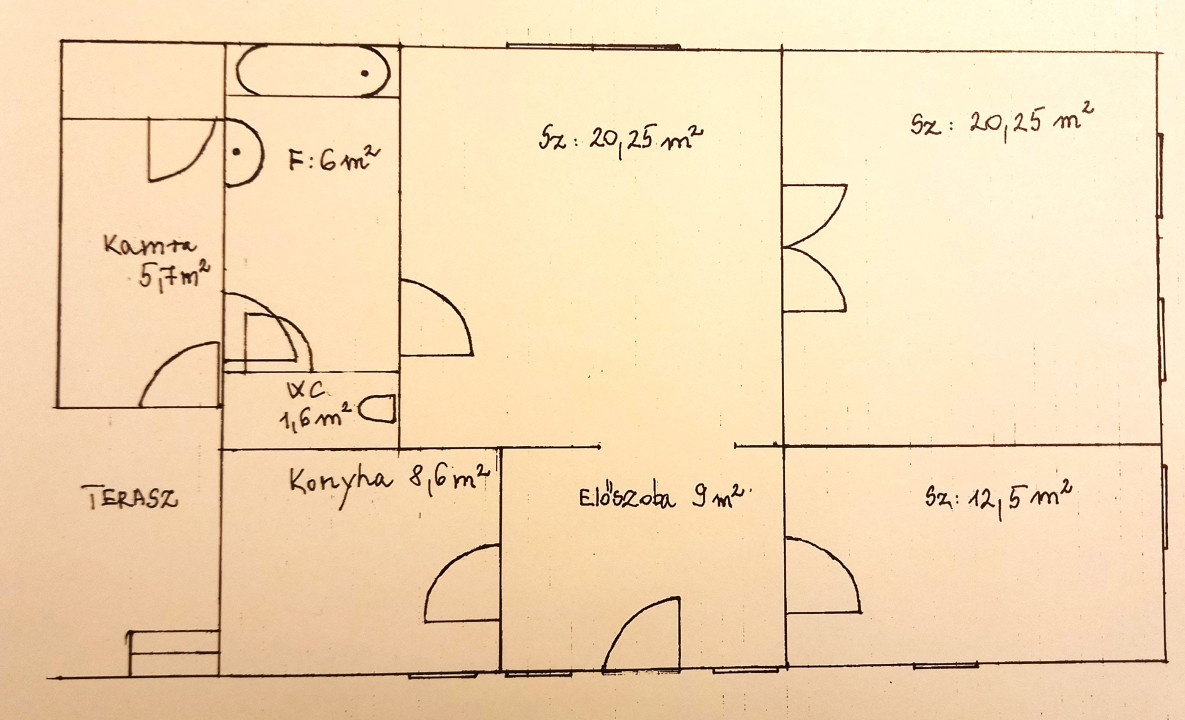 - három szoba (20,25 m²; 20,25 m² és 12,5 m²),