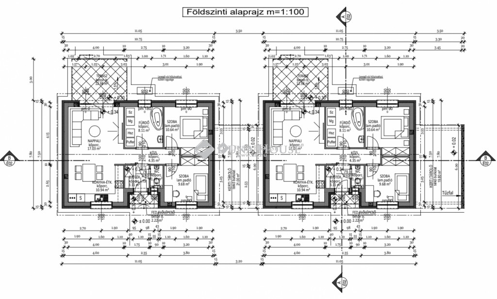 A teljes, 2940 m²-es területen 4db sorházi jellegű családi ház épül. Minden ingatlanhoz saját telekrész tartozik. (400 m²)