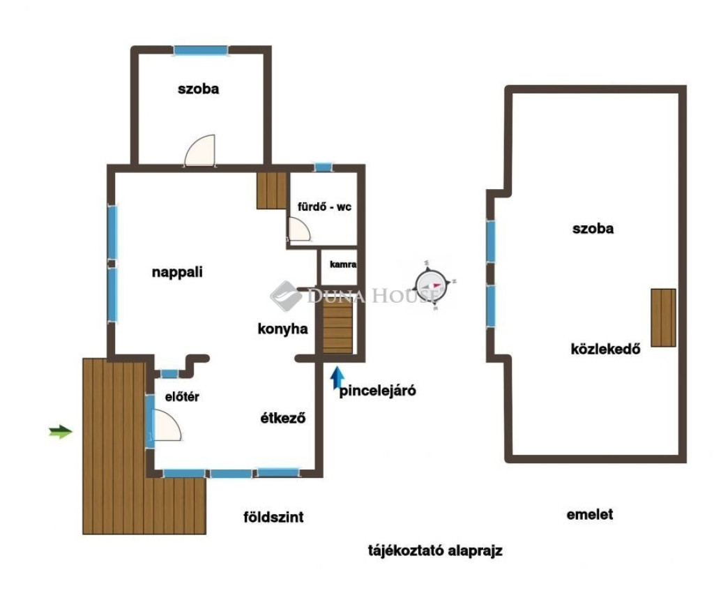 - földszinten amerikai konyhás nappali, hálószoba, zuhanyzós fürdő wc-vel, háztartási helyiség, kamra, étkező, épített lépcső