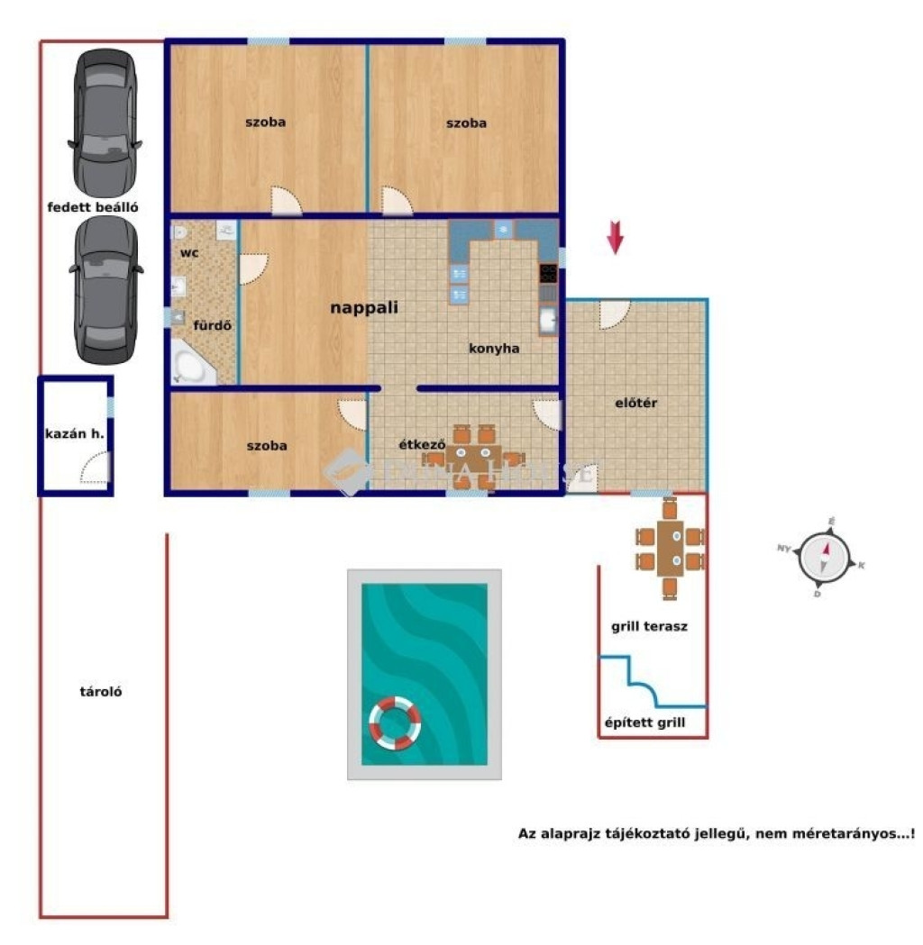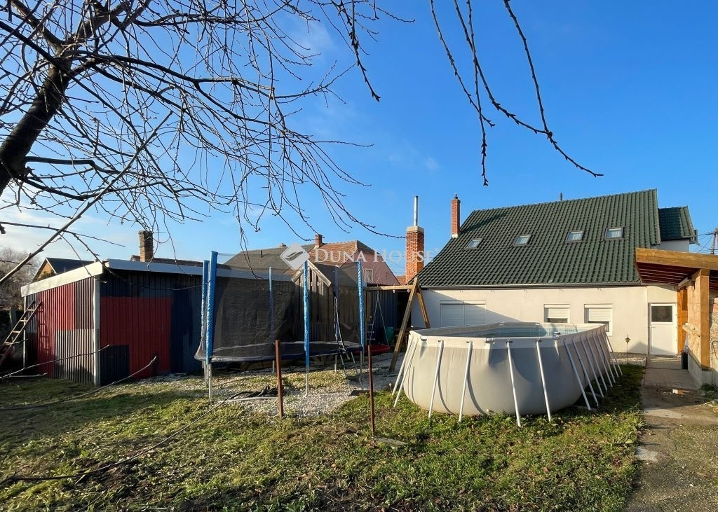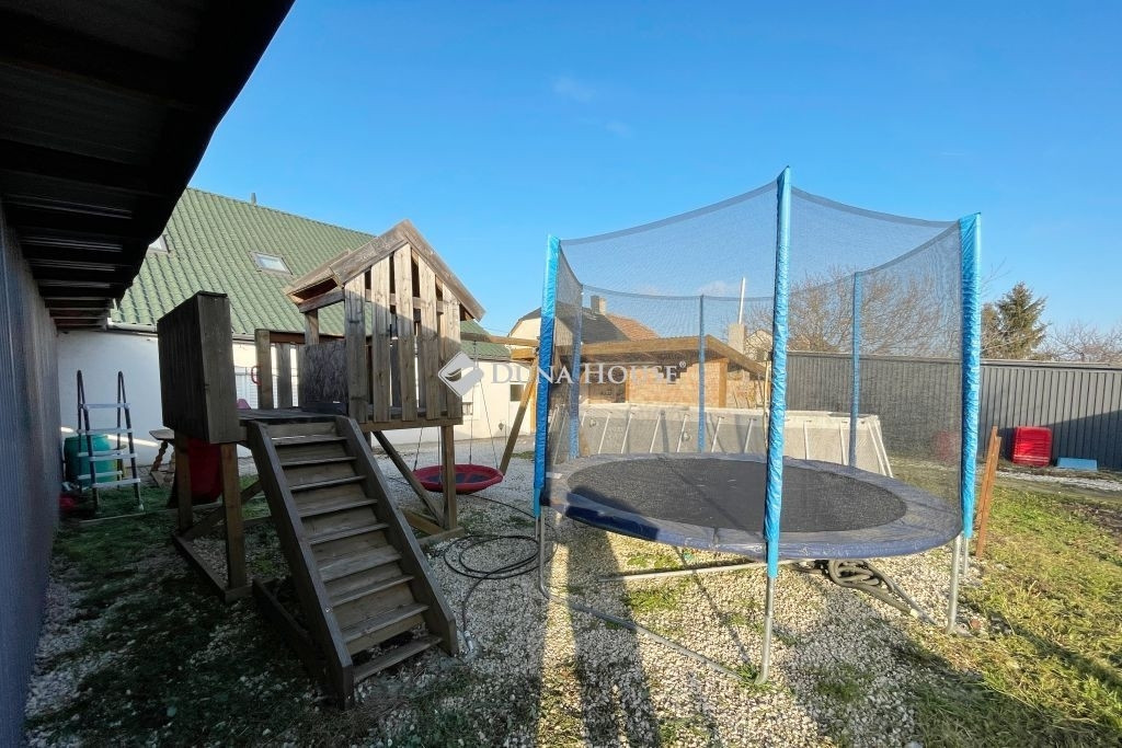 Az épület mögötti kert biztosítja a kikapcsolódást kicsinek és nagynak egyaránt... Van itt fedett terasz épített grillsarokkal (20 m2), gyermek játszótér, kerti medence és egy jókora tároló melléképület (40 m2). A telek 798 m2.