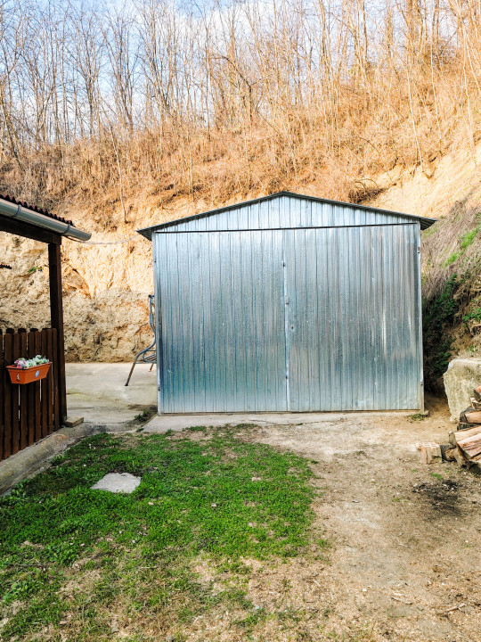 Az udvaron lemezgarázs és tároló is helyet kapott, így a parkolás és a kerti eszközök elhelyezése is kényelmesen megoldott.
