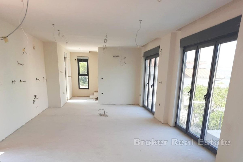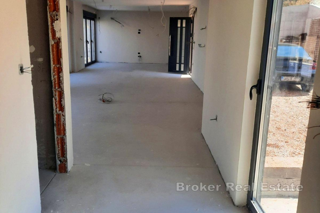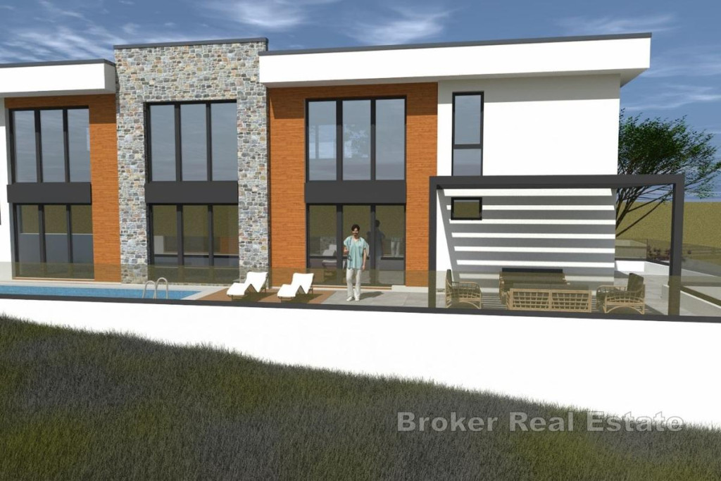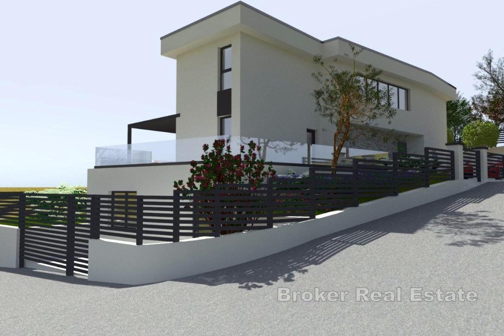 Modern villa with pool and sea view located in an attractive location on Čiovo, 270m from the sea. The property with a living area of 363m2 is located on a plot of 400m2 and consists of a basement, ground floor and first floor. The 45m2 basement floor also has a sauna, hydromassage tub, walk-in shower and toilet. Above this floor there are two terraces, a smaller terrace of 23m2 and a roof terrace of 107m2 with an impressive view of the sea. The ground floor of 93m2 consists of an open concept kitchen with dining room and living room and toilet. An internal staircase leads to the first floor of 95m2 where there are three bedrooms with their own bathrooms. The outdoor area is enriched with a swimming pool with a sunbathing area and a covered area with a pergola where there is an outdoor dining area. It has a parking space. An attractive offer make the location, which is within walking distance of the beach, 10 minutes’ drive from Trogir, and 45 minutes from Split. BROKER REFERENCE ID:5124/30