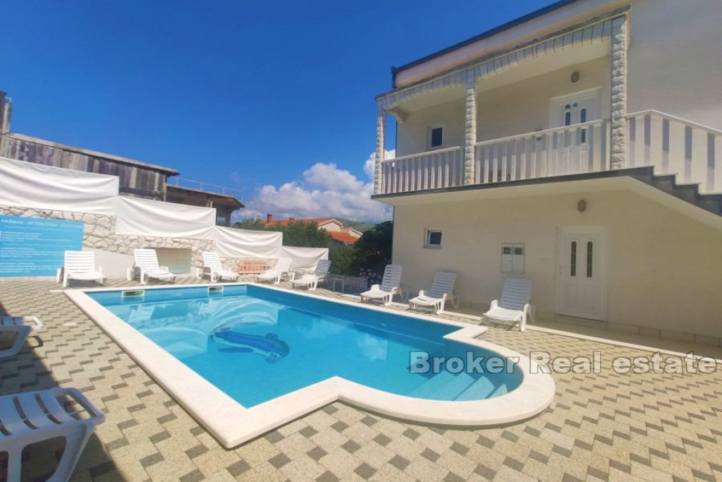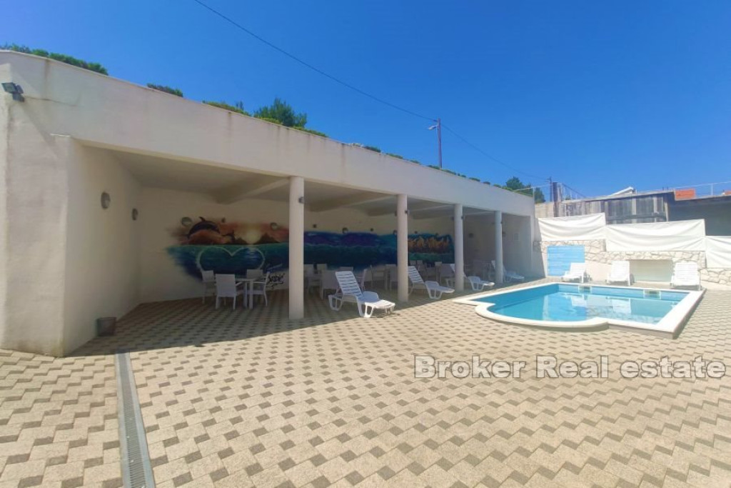 For sale is an exceptional apartment house consisting of seven separate apartments, each of which offers a stunning view of the sea. This charming property comprises basement, ground floor, first floor and attic. On the ground floor and on the first floor there are four equally equipped two-room apartments. In the basement there is a one-room apartment that is fully furnished and equipped. There are two smaller one-room apartments in the attic that can accommodate three tenants each. On the north side of the lot, there is a parking lot for 7 vehicles, which descends gently to the beautiful garden of this interesting property. The central position is occupied by a wonderful swimming pool, and a covered area with chairs, tables and sunbeds to enjoy in the summer by the pool. Due to the really large and spacious space, the property offers countless possibilities in terms of design solutions. Extremely safe for children and pets, the plot is fenced on all sides. It is only 120 meters from the sea and the first beach, shops are a 5-minute drive away, while the center of Trogir is a 10-minute drive from the building itself. The apartment house is ideal for tourist purposes, offers excellent potential for renting, and at the same time serves as an idyllic family villa for year-round living. BROKER REFERENCE ID:2040/46