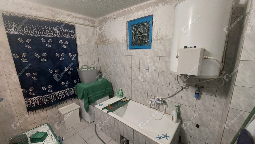 A konyha egyedi hangulatát a téglából épített, rusztikus jellegű konyhabútor-alap adja. A beépített sütő és főzőlap a vételár részét képezi, valamint a stílusban hozzá illő csaptelep és mosogató is beépítésre került. A melegvizet gázbojler biztosítja. A fürdőszoba nagyméretű káddal felszerelt.
