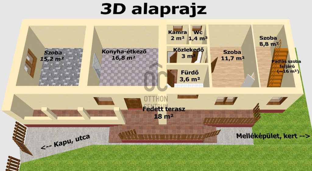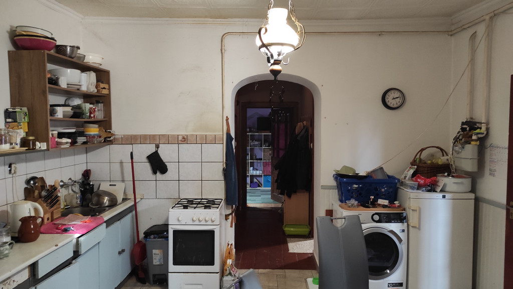 A konyhától jobbra lévő részek (fürdő, kamra, wc, +2 szoba) téglából épültek 2000-ben. Az utolsó szobából pedig egy fa lépcső vezet a tetőtéri szobához (a tetőtéri szoba ~18nm, nincs hozzászámolva a nettó lakótérhez).