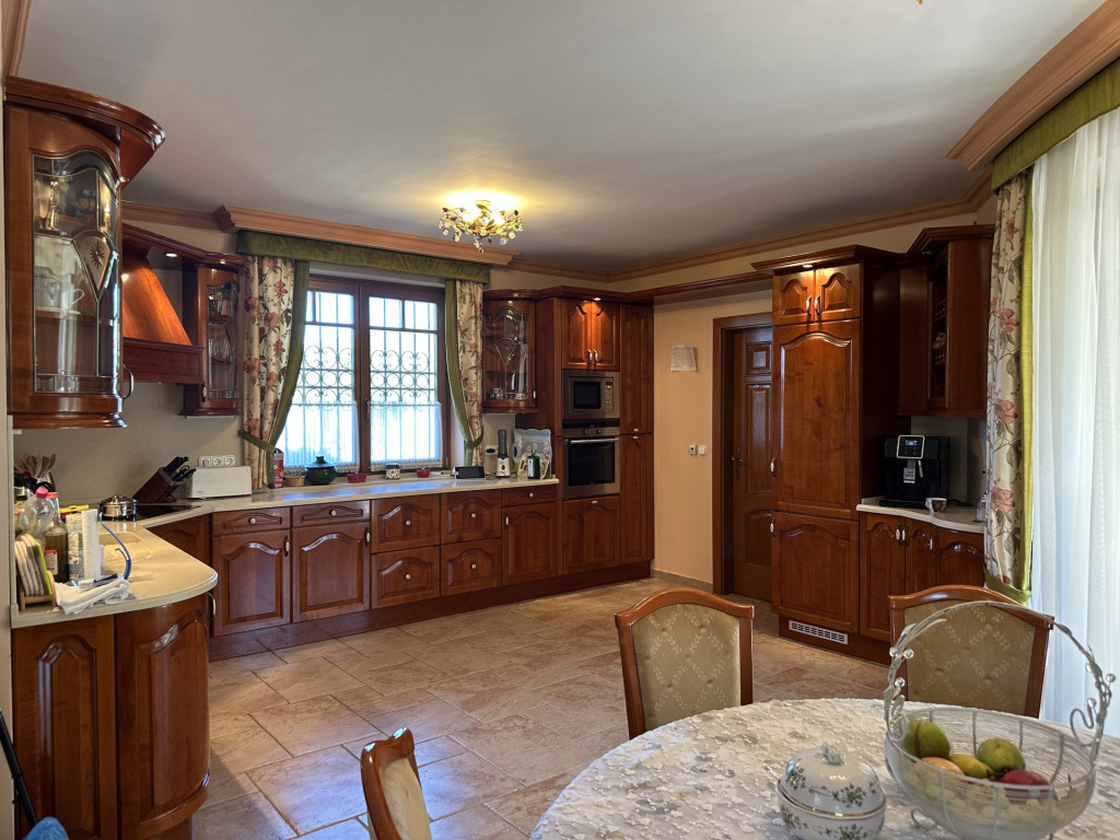 A nagyon nagy, kézzel készített, tömörfából készült, magas minőségű konyha az étkezővel együtt a ház szíve.