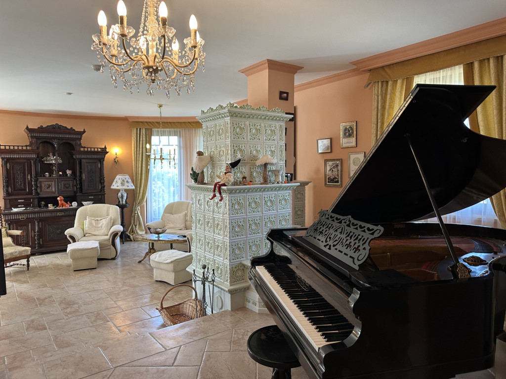 A nappali nagyvonalú és hívogató – a hatalmas ablakfelületek rálátást biztosítanak a gyönyörű kertre. A kézzel készített herendi csempékkel díszített exkluzív cserépkályha kellemes meleget és otthonos hangulatot áraszt.