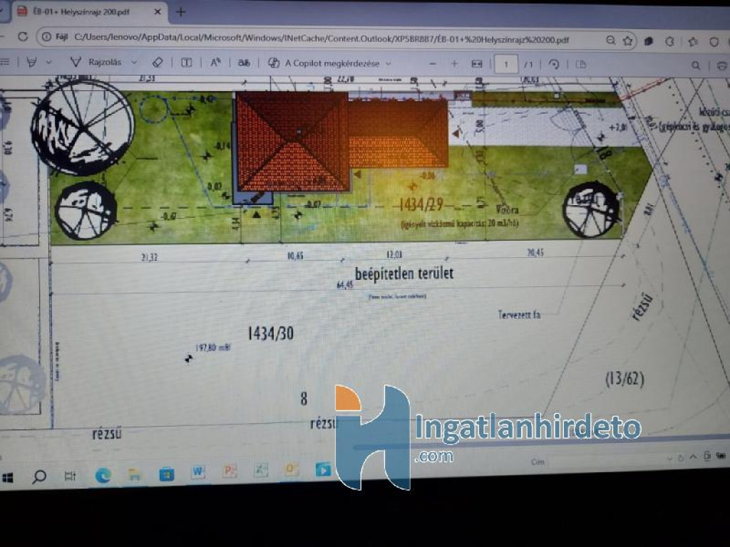 A képeken a két telek egybe van bekerítve, így a mérete 2341 m2, 40x54 méteres saroktelek. A terület fásítva, babérmeggyel a kerítés vonalában beültetve, és egy kerti tárolóval lett kialakítva. Ha most vásárolja meg az ingatlant, még kitudja választani a burkolatokat, a konyhaszekrényt, és a fürdőszobai szanitereket. Beköltözés várható ideje, szerződéskötéstől számított kb. 3 hónap, ami a választott anyagok beérkezésétől is függ.