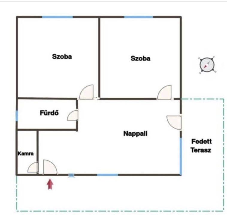 • Helyiségek: nappali, 2 hálószoba, konyha, kamra, fürdőszoba, fedett terasz