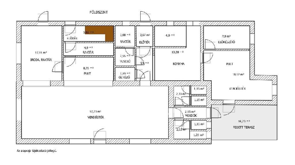 A 258m2 hasznos alapterületű teljeskörűen felújított és korszerűsített ingatlan földszinti része nettó 163m2 alapterületű, eredetileg vendéglátó funkcióra lett kialakítva, de akár üzletnek, irodának is kiválóan alkalmas lehet. A tetőtérben kialakított külön bejáratú lakás hasznos (190cm belmagasságot elérő) alapterülete 95m2, amely 5 lakószobát, gardrób szobát, fürdőszobát, WC-t foglal magában, valamint egy hangulatos, tágas (40m2-es), részben fedett terasz növeli az életteret, ahová 2 szobából is kijuthatunk.