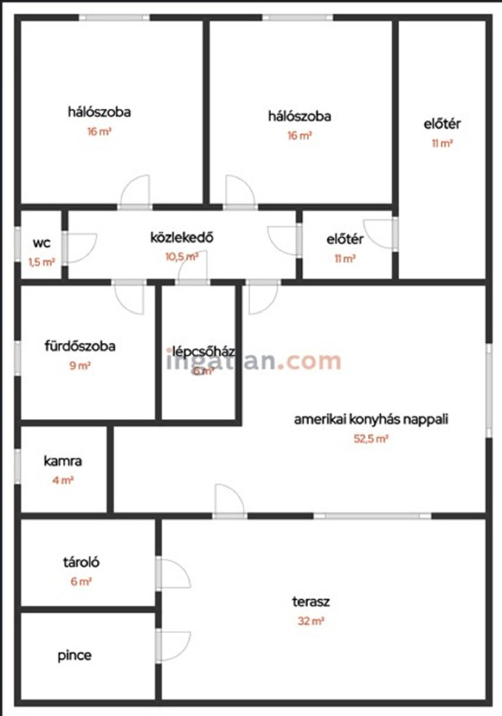 A főépület 300 m2, belső 2 szintes, kiváló elosztású, tágas, világos, dupla komfortos, amerikai konyha-nappali, 5 hálószoba, gardrób, hobbi szoba, szauna, és egy szuper 32 m2- es terasz helyiségekkel, (a fotók között található alaprajz szerinti elosztásban).