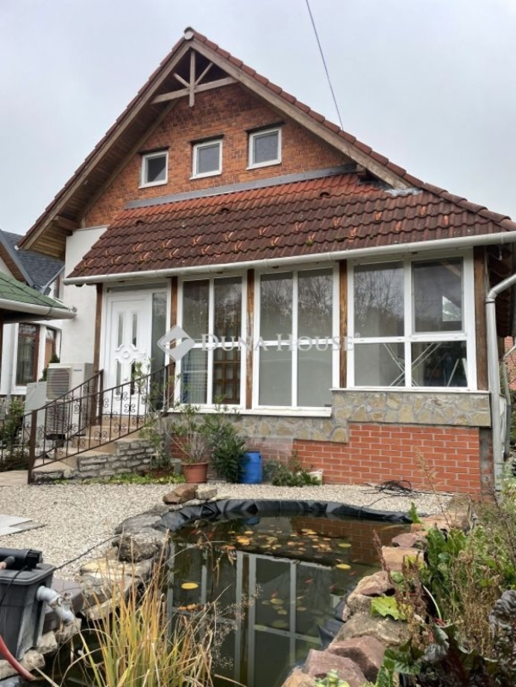 A kert igazi különlegesség: gondozott, zöld növényzettel körülvett terület, melyben kerti tó, gyümölcsfák, kerti kiülő, valamint egy Hörmann-ajtóval szerelt garázs és tároló található.