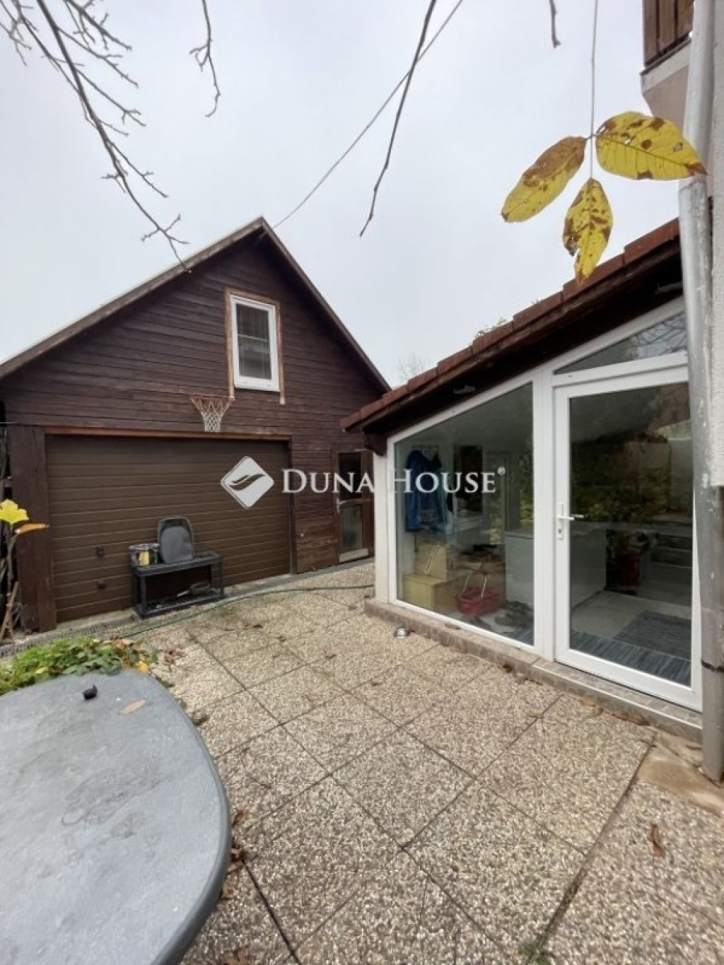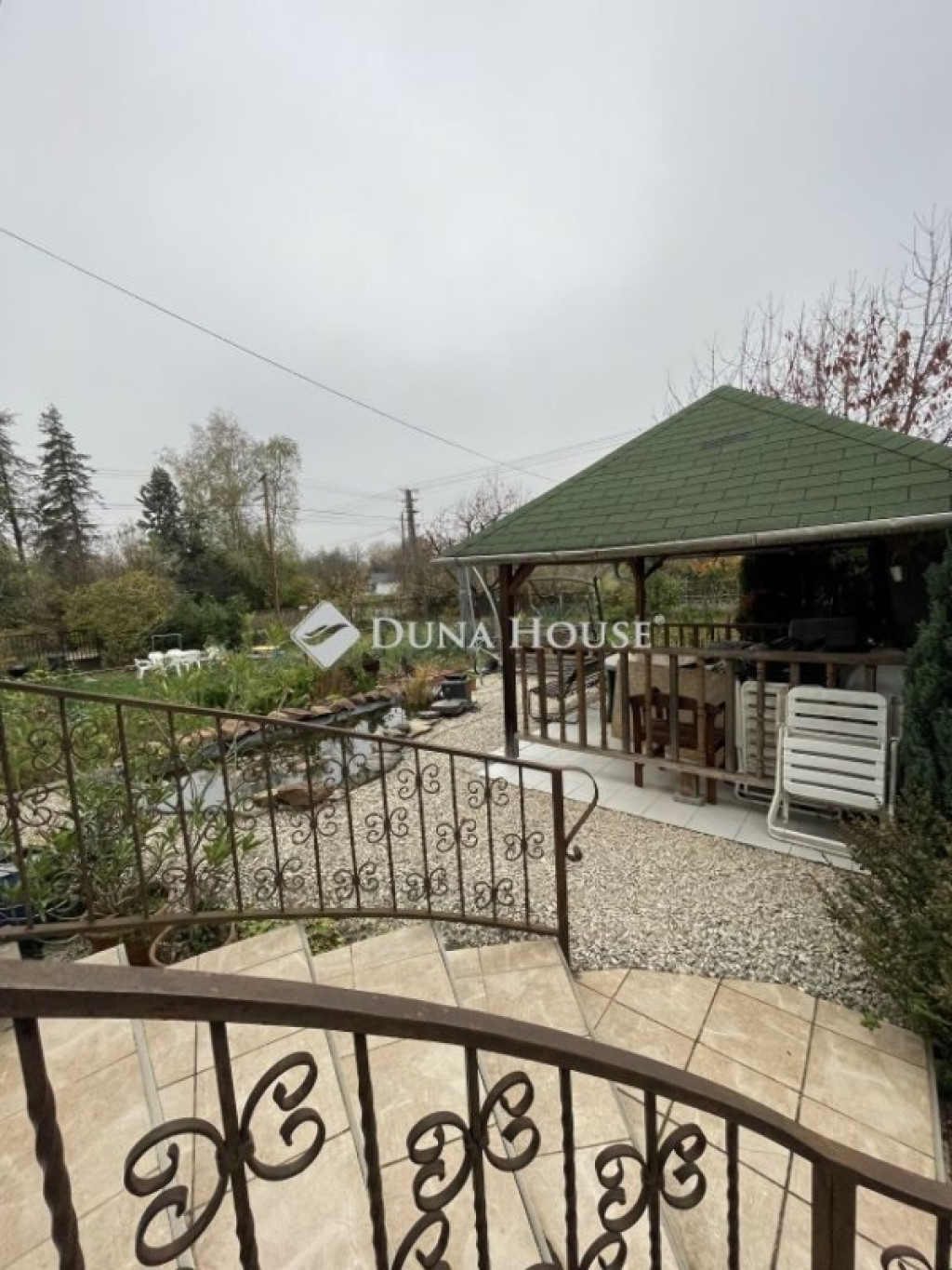 A kert igazi különlegesség: gondozott, zöld növényzettel körülvett terület, melyben kerti tó, gyümölcsfák, kerti kiülő, valamint egy Hörmann-ajtóval szerelt garázs és tároló található.