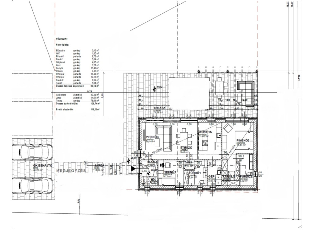 A 2026-ben épülő ingatlan 93 négyzetméter hasznos alapterülettel rendelkezik, mely ideális elrendezést biztosít: egy körbe napozott amerikai konyha-nappali mellett két tágas hálószoba, két különálló fürdőszoba, előszoba és háztartási helyiség került kialakításra.