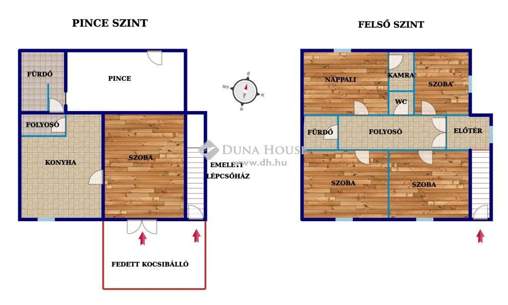 - Az alsó és felső bejárat között kb. 50 m²-es fedett terasz található, amely ideális parkolóhely az autónak és védelmet nyújt az időjárással szemben.
