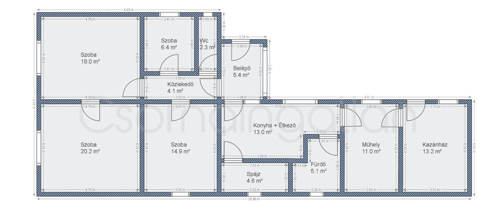 Az ingatlan magas alapos, 91,8 m2 hasznos alapterülettel.