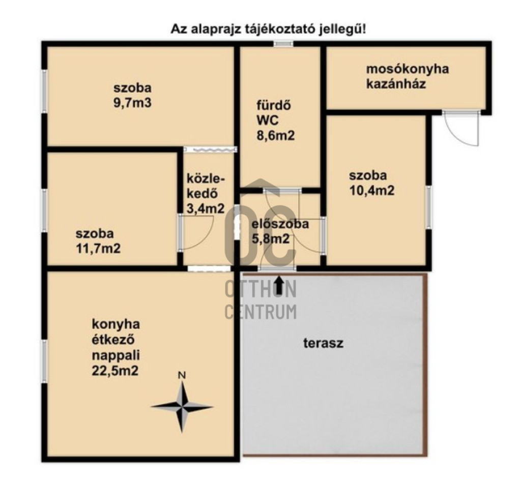Helyiségek: 3 hálószoba, konyha-étkező-nappali, közlekedő, előszoba, fürdőszoba wc-vel, mosókonyha-kazánház.