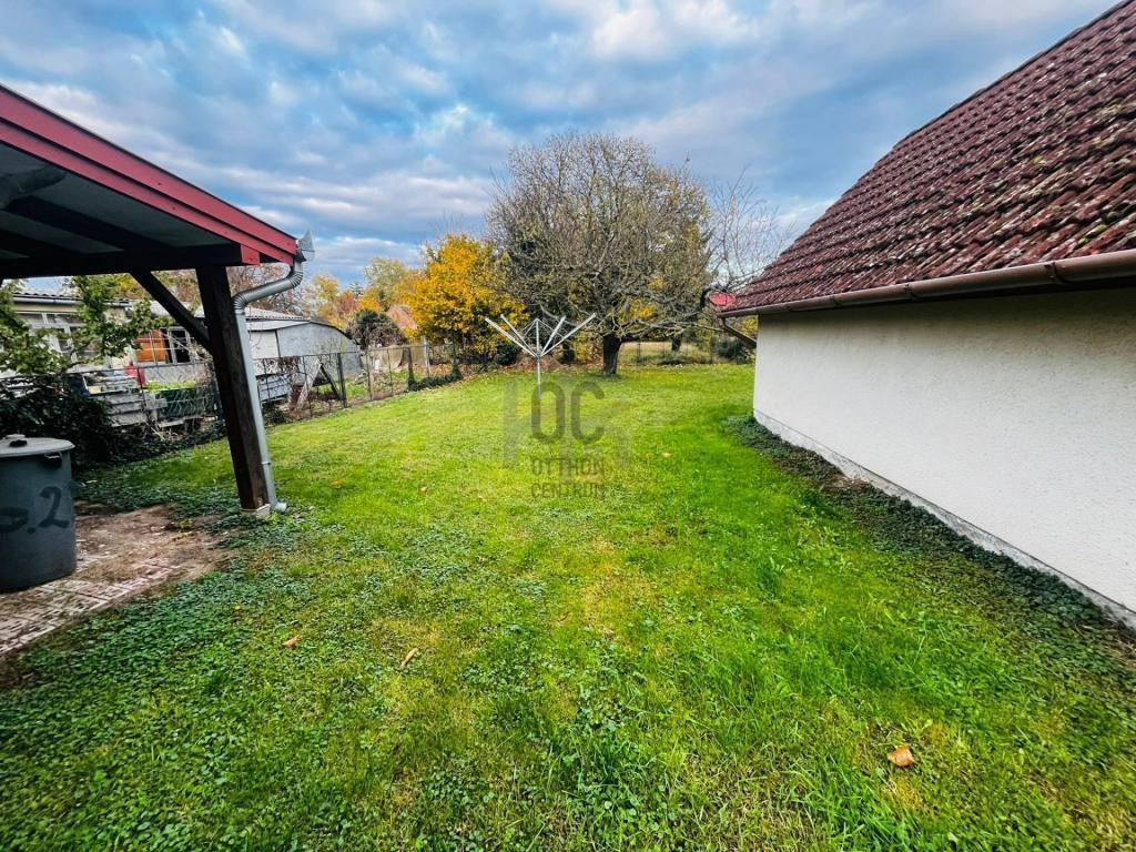 Telek: 840 m², teljesen körbekerítve betonozott kerítéssel, kovácsolt vaskapu