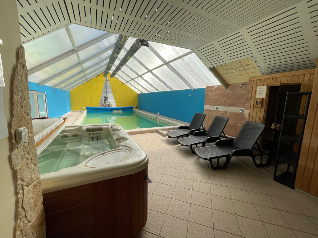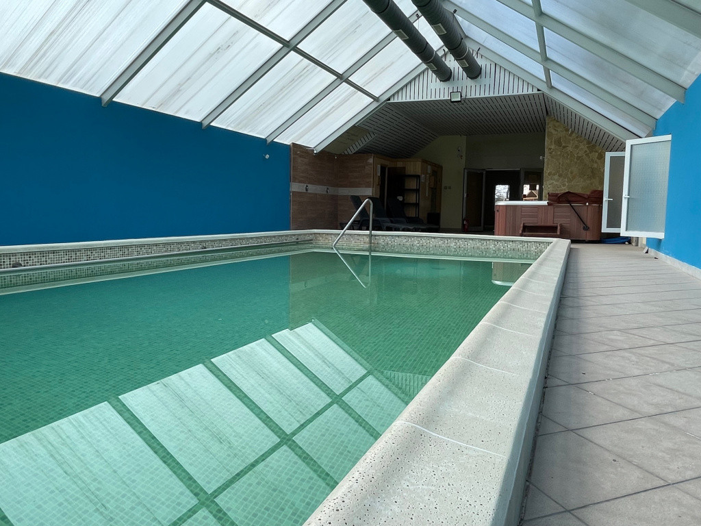 A welnes részleg 60 nm-es fűtött : medence, szaunák,jakuzzi,zuhanyzó wc, relaxáló helyiség bár pulttal, pihenő ágyakkal.