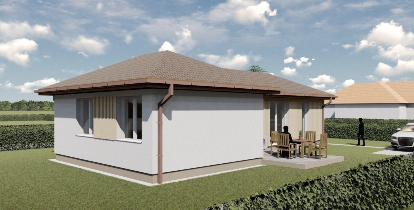 A ház belső elrendezése praktikus és élhető. A világos, tágas amerikai konyhás nappali a családi élet központja, ahol a nagy üvegfelületeknek köszönhetően egész nap természetes fény áramlik a térbe. A nappaliból közvetlen kijárat nyílik a teraszra, így a belső és külső tér harmonikusan kapcsolódik egymáshoz. A két külön nyíló hálószoba kényelmes méretű, jól bútorozható. A fürdőszoba káddal és WC-vel felszerelt, emellett külön vendég WC is kialakításra kerül. A kamra további praktikus tárolási lehetőséget biztosít.