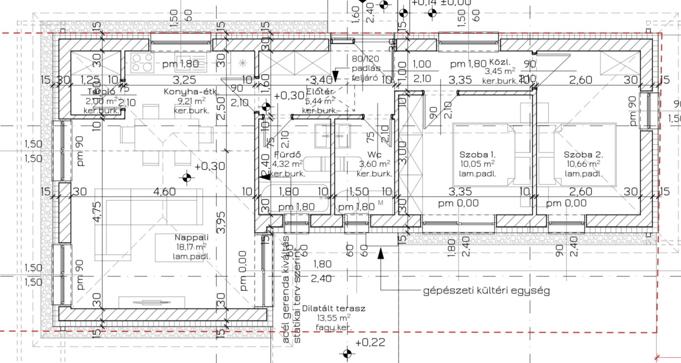 Az ingatlan nettó 69 m² lakóterülettel, valamint egy 13,5 m²-es terasszal rendelkezik. A hozzá tartozó 546 m²-es telek elegendő teret biztosít kert kialakításához, játszótérhez, veteményeshez vagy akár egy későbbi bővítéshez is.