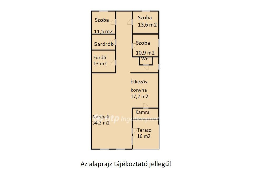 Az ingatlan beosztása nagyon praktikus: előszoba, nagy étkező konyha, kamra, tágas nappali, széles közlekedő, 3 külön nyíló hálószoba, 2 fürdőszoba toalettel.