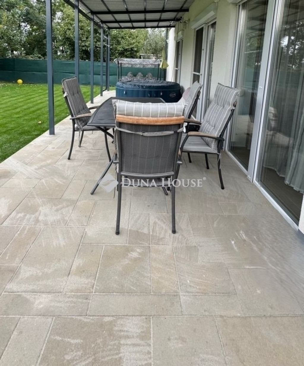 A kertkapcsolatos élményt a fedett terasz és a gyönyörű, gondozott zöld kert teszi