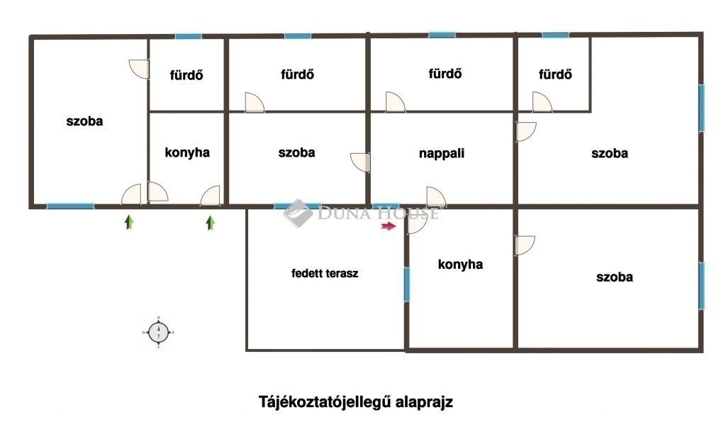 Helyiségei: nappali, 4 szoba, 4 fürdőszoba, 2 konyha, fedett terasz