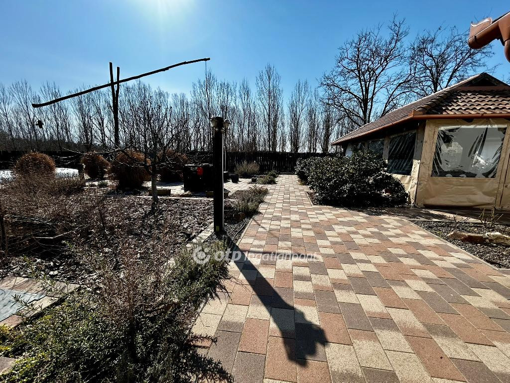 - Az öntözőberendezéssel ellátott, parkosított és térkövezett udvaron