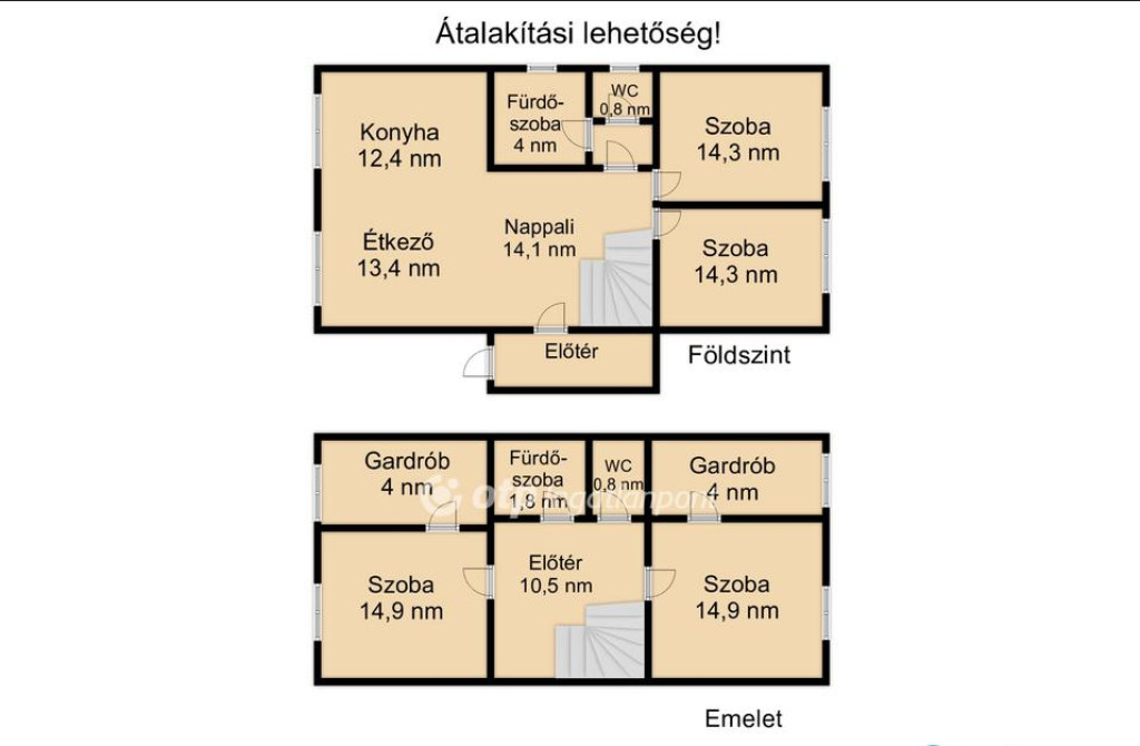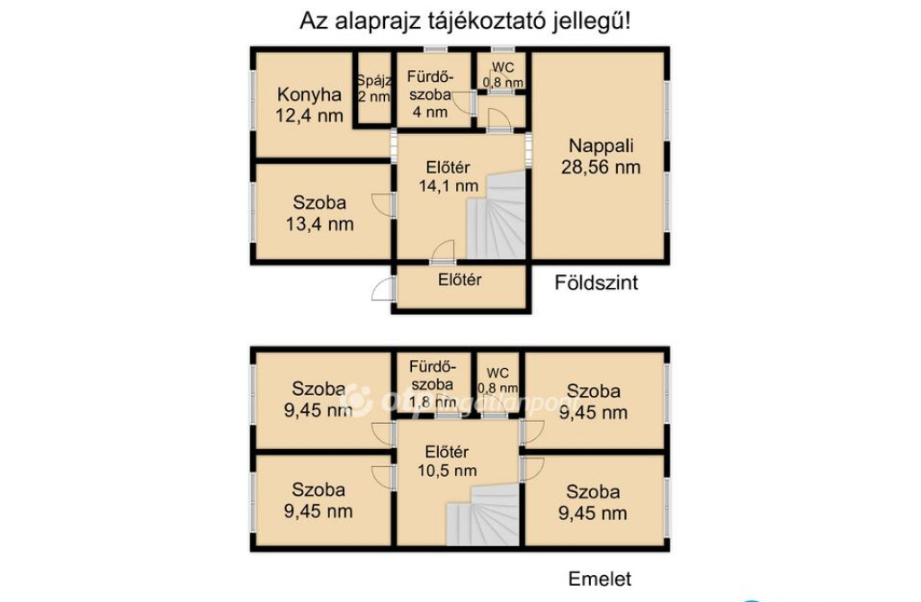 - földszint: konyha-étkező, spájz, hall, 1 külön nyíló szoba, előszoba, nappali, fürdőszoba és WC külön helyiségben
