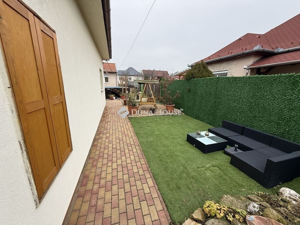 A bejutást a telekre elektromos kapu biztosítja, több autó tud a térkövezett részen parkolni, a telken található még egy hatalmas medence, valamint egy 3 részes tároló a kerti szerszámok tárolására.