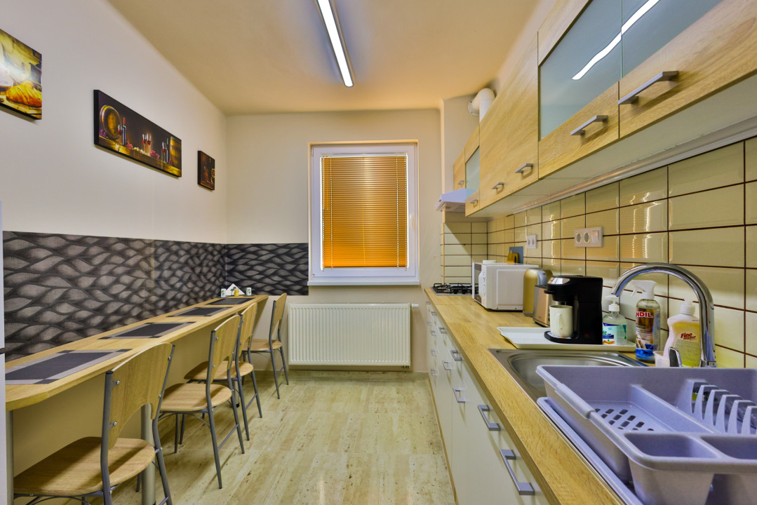 -az 1. emeleten egy nagyon jól felszerelt konyha áll rendelkezésre, amelyet a lakók közül bárki használhat