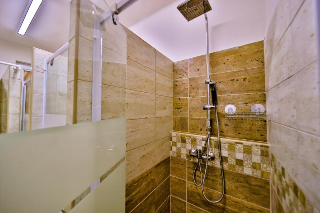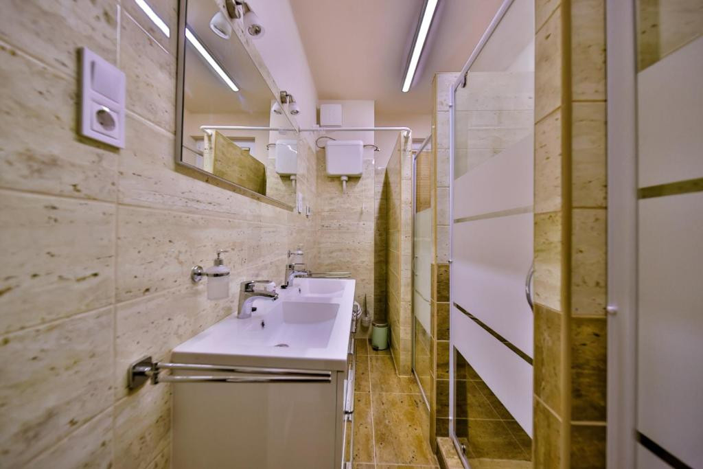 -1. emeleten 1 db 4 ágyas és 1 db 3 ágyas szoba külön helyiségben több zuhanykabinnal rendelkező fürdőszoba és WC