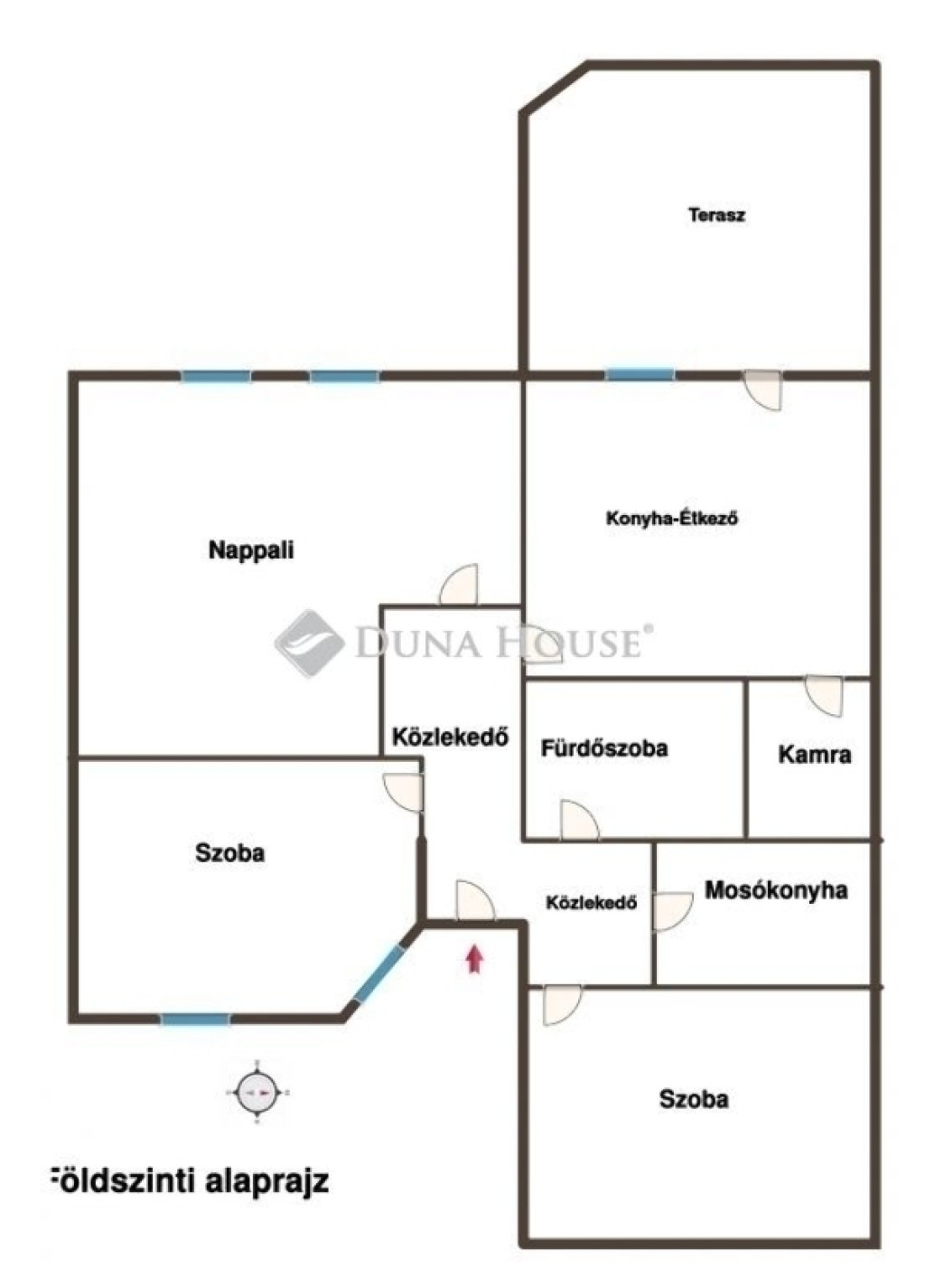 - földszint: egy tágas nappali, étkező- konyha, spájz, 1 szoba, 1 félszoba, közlekedő, fürdőszoba WC-vel, előszoba, mosókonyha, fedett terasz, lépcsőfeljáró