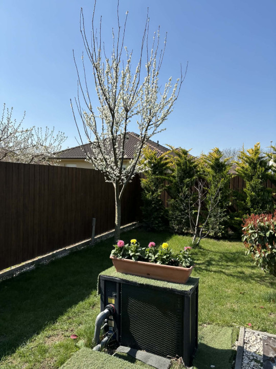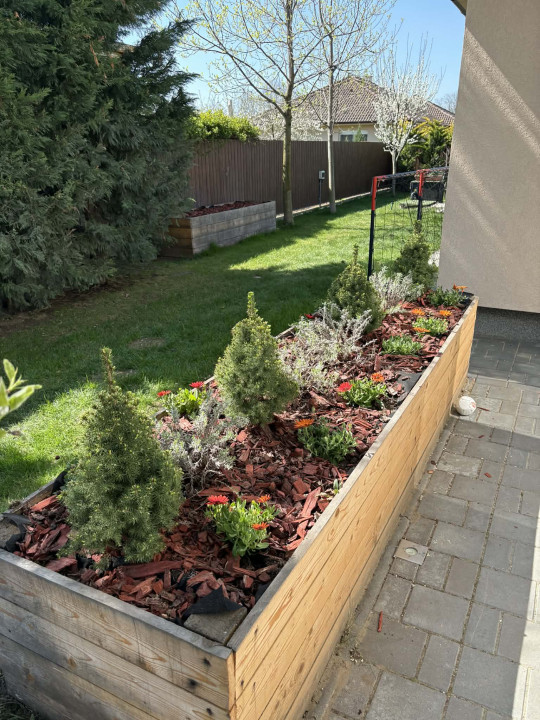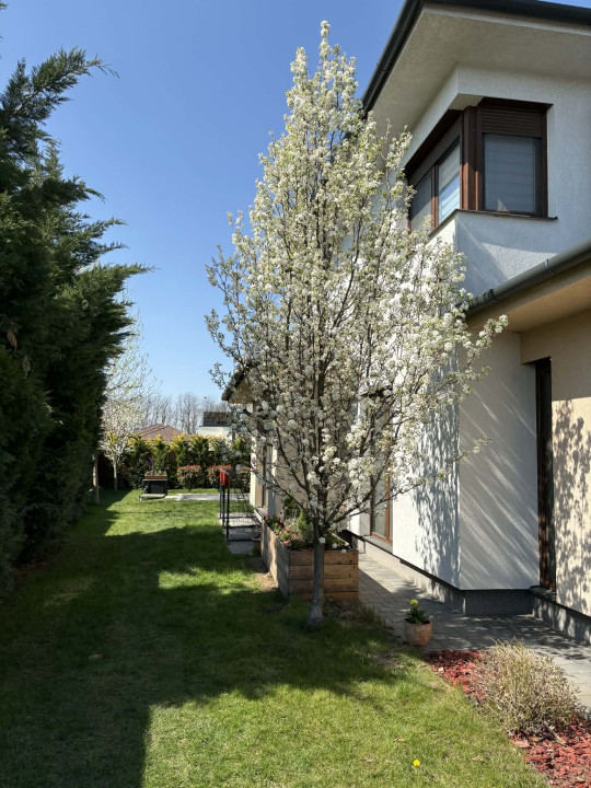 A 635nm-es, öntőzőrendszerrel és esővíz szikkasztóval ellátott, parkosított kert medencével, játszótérrel, valamint főzési lehetőséggel bővül ki. A telek végében betonalapra épült, 10nm-es kisház, fedett bográcsozóhely, valamint a hátsó kertre néző 20nm-es terasz is szolgálja az itt élők kényelmét.