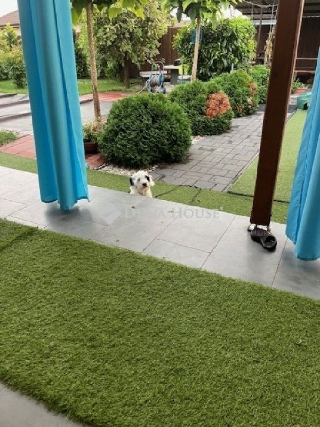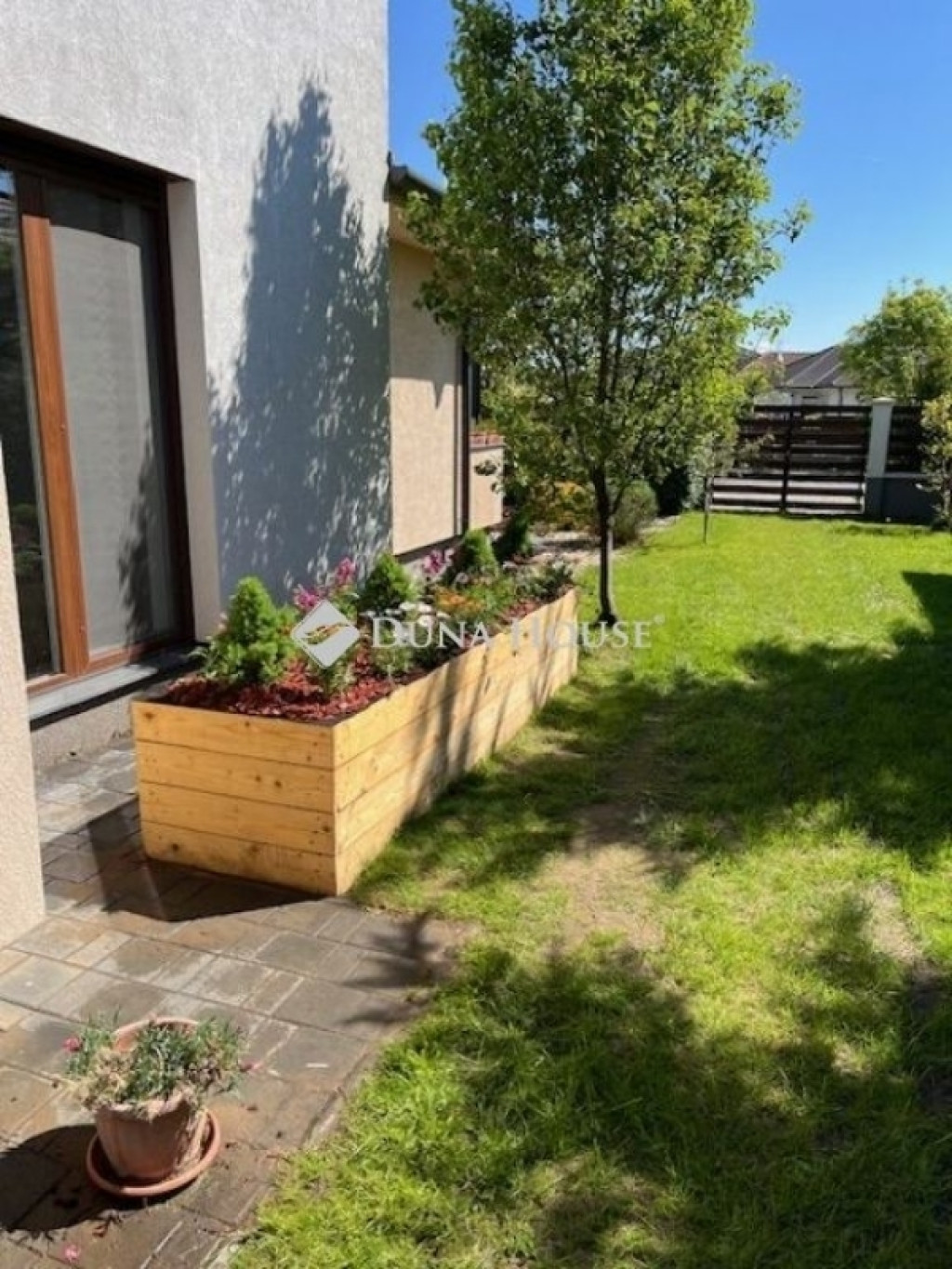 A 635 m²-es, parkosított telek automata öntözőrendszerrel, csepegtetővel és esővíz-szikkasztóval ellátott. A kertben kültéri medence, fedett bográcsozó- és szalonnasütő hely, játszótér, valamint egy 10 m²-es, betonalapra épített kisház található. A hátsó kertre néző, 20 m²-es fedett terasz ideális helyszín családi és baráti összejövetelekhez.