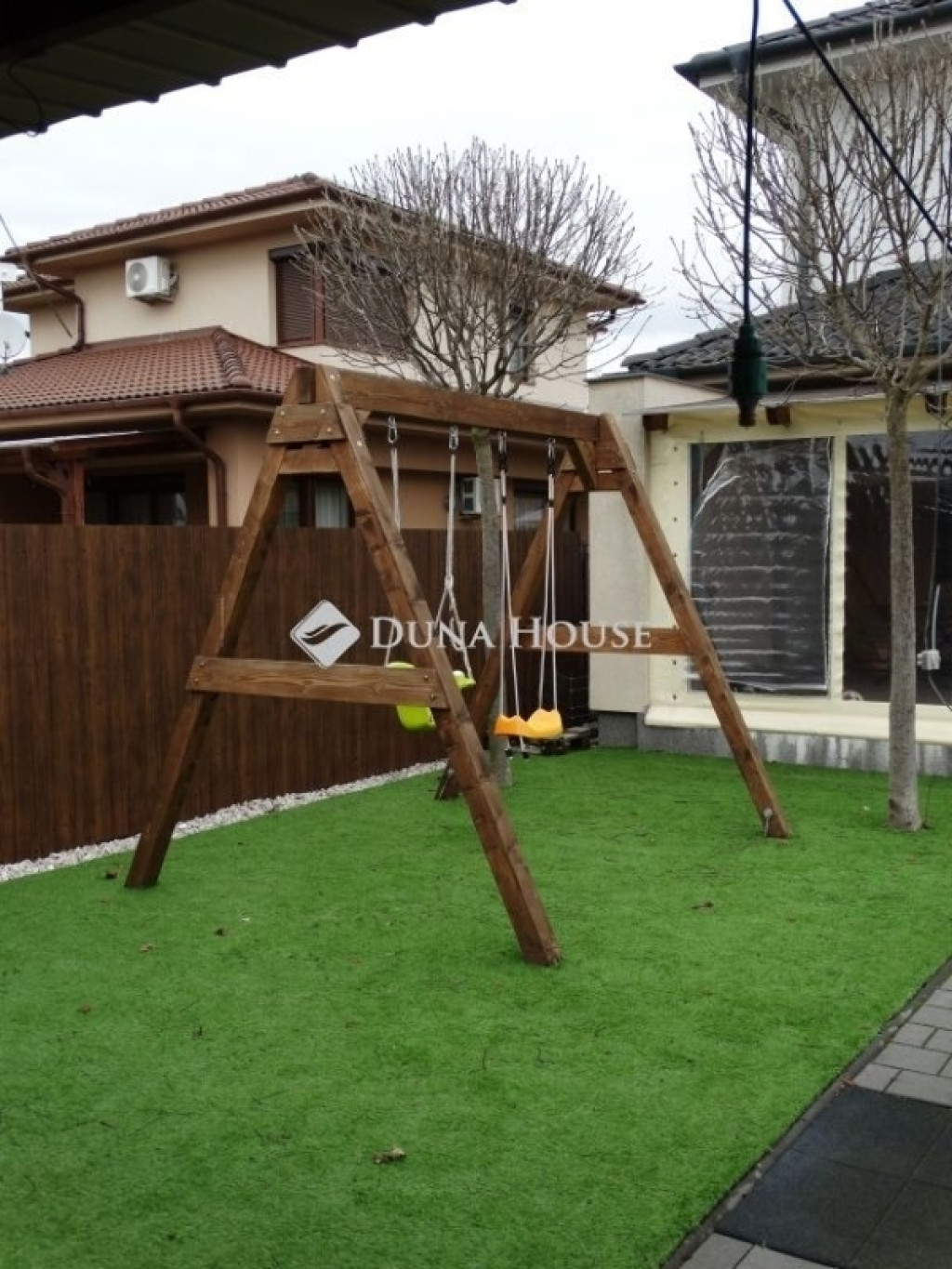 A 635 m²-es, parkosított telek automata öntözőrendszerrel, csepegtetővel és esővíz-szikkasztóval ellátott. A kertben kültéri medence, fedett bográcsozó- és szalonnasütő hely, játszótér, valamint egy 10 m²-es, betonalapra épített kisház található. A hátsó kertre néző, 20 m²-es fedett terasz ideális helyszín családi és baráti összejövetelekhez.
