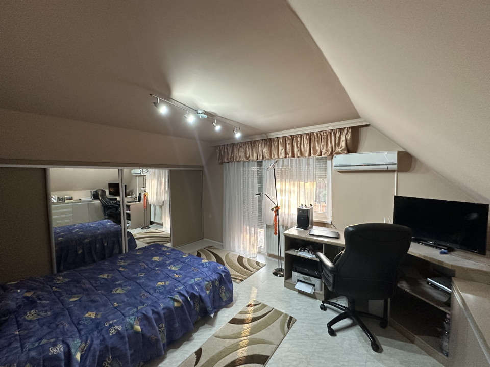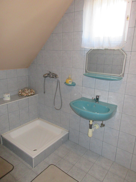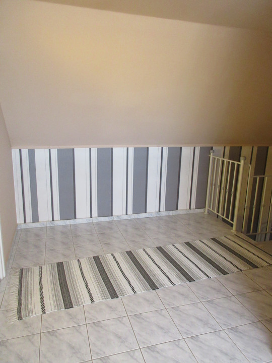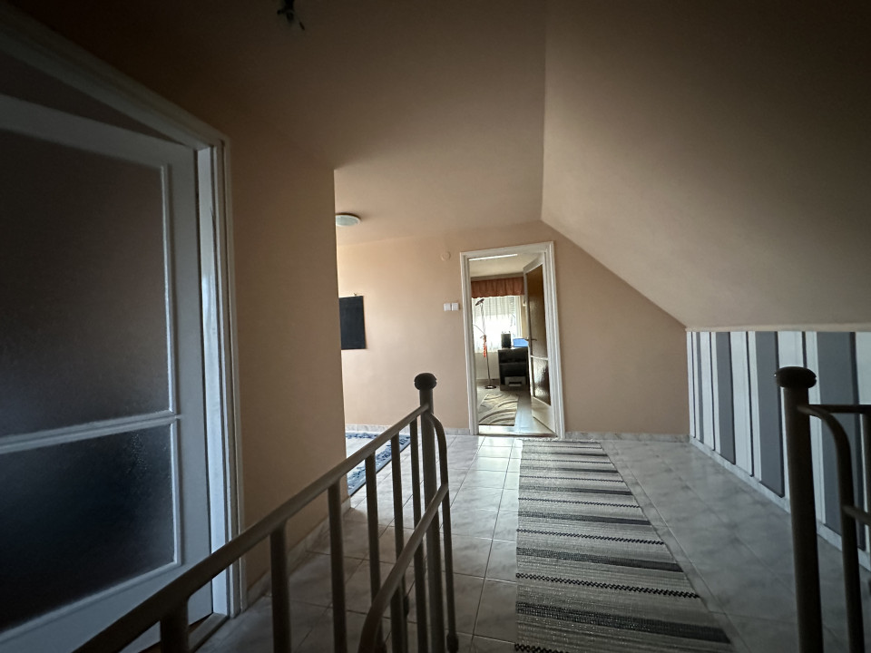 Helyiségei: a földszinten--- nappali, étkezőkonyha, hálószoba, fürdőszoba (fürdőkádas) + toalett, előszoba, közlekedő, 12nm-es fedett terasz. Az emeleten: nappali+2 külön nyíló szoba, fürdőszoba tusolóval + toalett, közlekedő, erkély.
