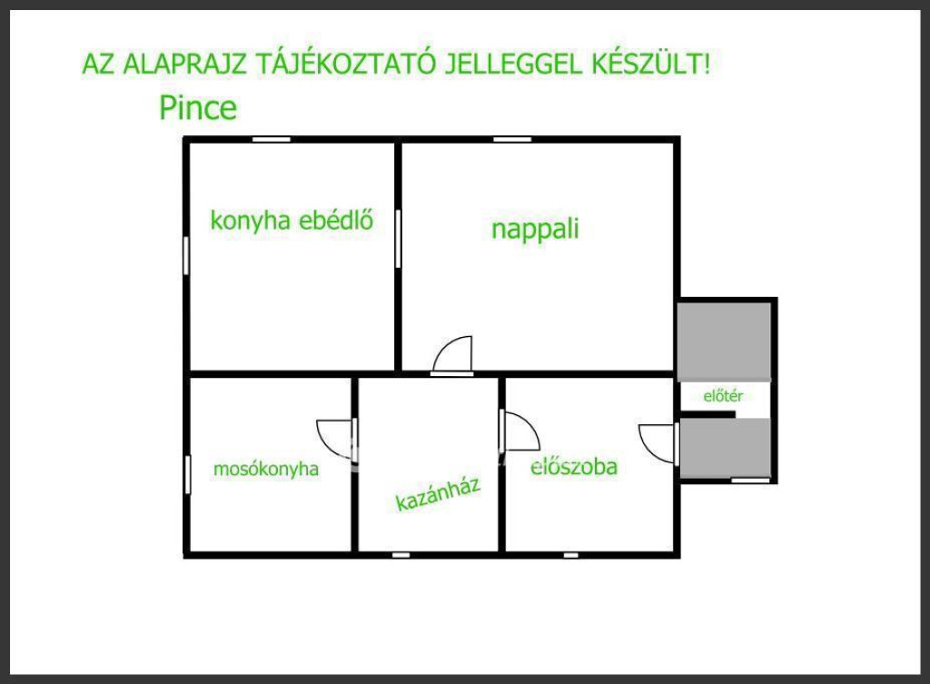 A pince szuterénként van használva - helyiségei: nappali, konyha étkezővel, mosókonyha, kazánház, tároló helyiség, fürdőszoba, Wc.