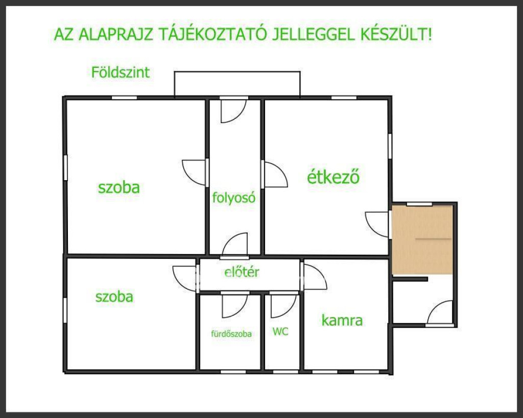 A földszint helyiségei: 2 szoba, konyha étkezővel, fürdőszoba, Wc és kamra.