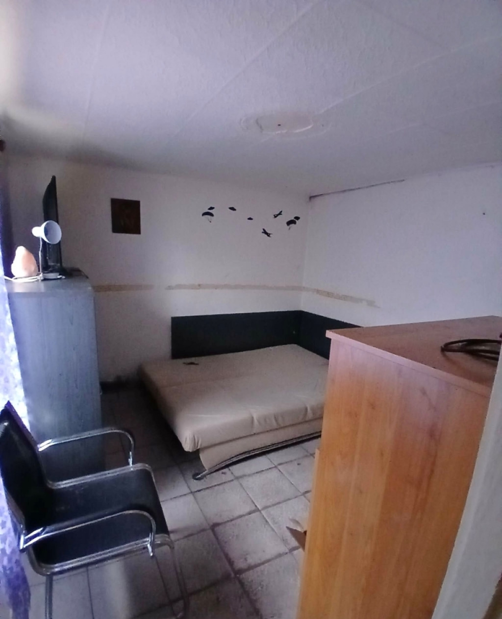 A külön bejáratú szoba padlózata beton. Szükség esetén egybenyitható a lakás többi részével.