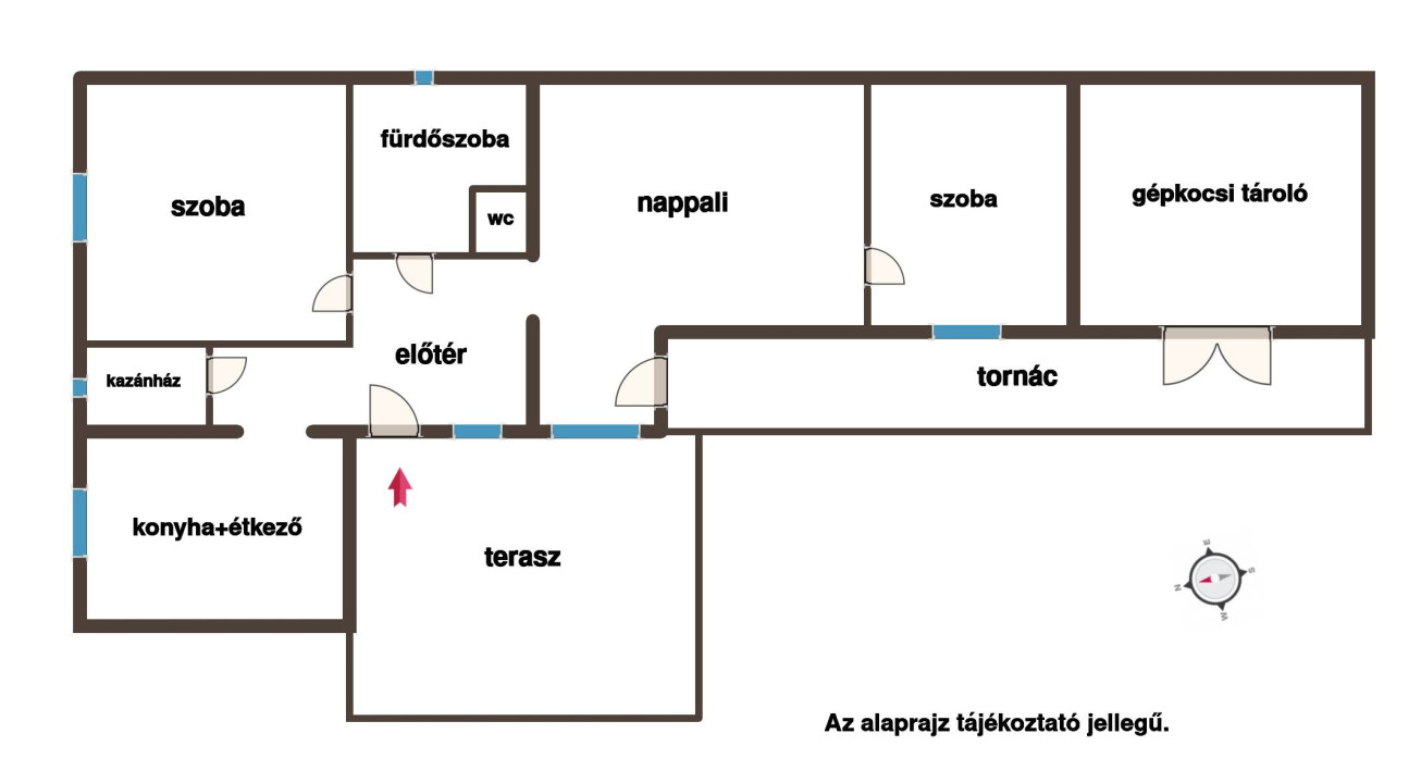 A ház központi részén egy tágas, hangulatos nappali helyezkedik el, melynek plusz értéket egy látványos, vízteres kandalló ad. Ez nem csak esztétikailag, hanem fűtés szempontjából is lényeges, ugyanakkor egyedi nem szokványos megoldás. A nappalin kívül még 2 külön nyíló szoba, egy hatalmas konyha, kamra, előszoba, külön wc és fürdőszoba, garázs és pince helyiségek tartoznak az ingatlanhoz. Az udvaron töltött nyugodt pihenést, a - nappaliból is közvetlen átjárható- tágas terasz teszi lehetővé.
