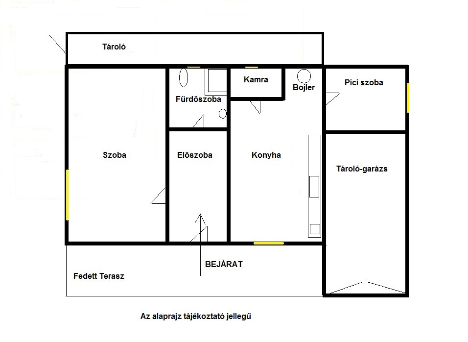 Tartalmaz: 25 nm-es fedett terasz, előszoba, egy szoba, egy kis szoba, étkező konyha, kamra, zuhanyzós fürdőszoba WC-vel, 20 nm-es tároló-garázs, és az épület végében szintén egy tároló rész.