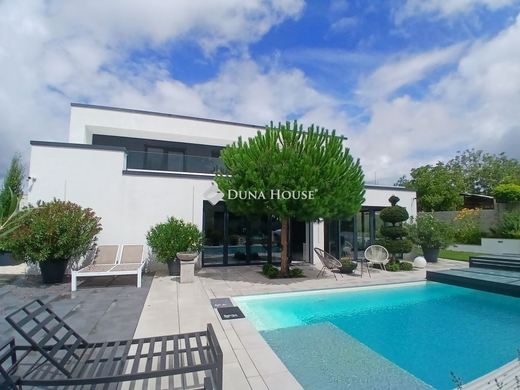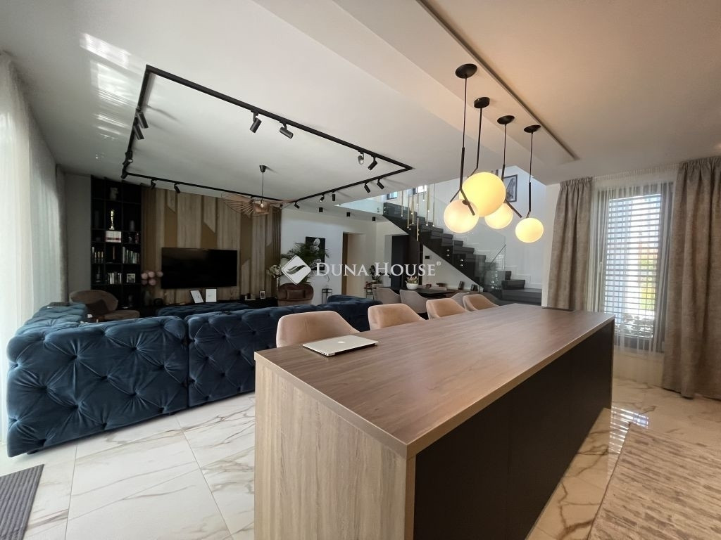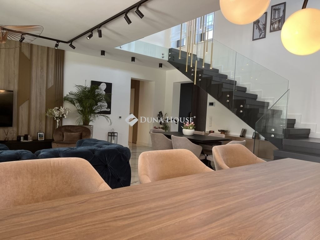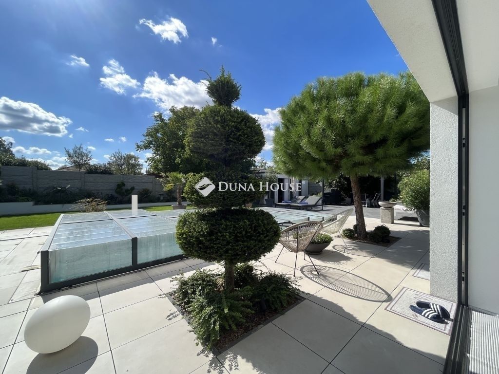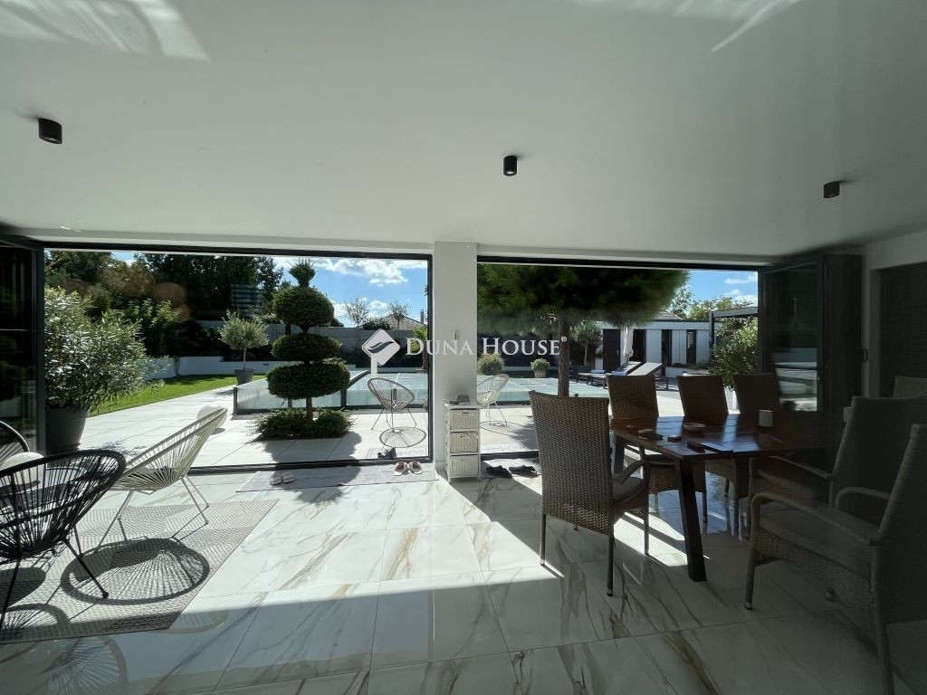 MINIMALISTA STILUSÚ PENTHOSE HÁZ !Eladásra kínálunk egy 2022-ban épült, napfényes, téglaépítésű családi házat a csendes kertvárosi övezetben fekvő Lenc telep kedvelt részén. A modern, minimalista stílusban megálmodott ingatlan a legújabb technológiai megoldásokkal, köztük hőszivattyús fűtési rendszerrel van felszerelve, ami egész évben biztosítja az otthon melegét és a környezettudatos energiagazdálkodástEz az ingatlan tökéletes választás lehet azok számára, akik egy modern és elegáns otthont keresnek csendes, zöld környezetben, de nem akarnak lemondani a város közelségének kényelméről sem. Összességében egy kiváló élettér, ahol a nyugodt pihenés és a mindennapi élet praktikumai tökéletes harmóniában ötvöződnek.Az otthont adó kertvárosi övezet nyugodt, csendes környezetet biztosít lakói számára, miközben a belváros könnyedén és gyorsan megközelíthető, így a mindennapi élet szükségleteinek kielégítése nem okoz gondot. Az autópálya csupán 10 percre található, ami kiváló hír azok számára, akiknek fontos az ország más részeibe való gyors hozzáférés.Az otthon nem csak a funkcionalitásáról és magas színvonalú technikai felszereltségéről ismert, hanem tervezésénél nagy hangsúlyt fektettek a kényelem és a pihenés lehetőségére is. A hangulatos, gondozott kert, ahol különleges növényzet vonzza a tekintetet, ígéretes helyszín családi és baráti összejövetelekre. Az ingatlan területén található, saját wellness részleg, beleértve az úszómedencét is, mindennapjainkba csempész luxust és felfrissülést.Az ingatlanban található összes bútor a vételár részét képezi.Extrák: Wellness központ: 8 x 4 x 1,5 méteres, ellenáramoltatós, 10 kW hőszivattyúval fűtött és fedett medence, szauna, fitnesz-terem és pihenő sarok. Grillezőterasz, melyet 3x4 méteres alumínium pergola fed be, elektromosan mozgatott lamellákkal és ledes világítótestekkel. Ajax okos riasztórendszer, távoli eléréssel és vezérléssel. HD felbontású kamerával szerelt kaputelefon. HD felbontású és éjjellátó biztonsági kamerarendszer, 8 db kamerával, melyek távolról vezérelhetőek és ellenőrizhetőek. Kétállásos garázs, szekcionált és hőszigetelt ajtóval, mobilról nyitható, elektromos úszókapuval. A garázs előtt 40 nm fedett kocsibeálló található, így összesen 4db autó elhelyezése megoldott az ingatlan kerítésén belül. 71 négyzetméteres, nyitott, panoráma tetőterasz. Okosotthon rendszerek megvalósításához csillagpontos hálózat teljesen kiépítve és kábelezve. Kerti tárolóban található egy mosdó / wc, a medence gépészeti helyisége és egy 20 nm tárolóhelyiség. A kerti és kültéri világítás minden elemét lakberendező tervezte és kiviteleztette, természetesen ledes világítótestekkel. Esztétikusan és harmonikusan parkosított kert, 8 körös automata öntözőrendszerrel és csepegtetővel.Műszaki tartalom: A használati melegvízhez és a fűtéshez dedikált, 16kW hőszivattyú lett beépítve (villanyórától külön kiépített kábelen), amihez 300 literes melegvíz-tároló és a fűtéshez külön 190 literes puffertartály tartozik. BWT vízlágyító rendszerrel kezelt víz. Padlófűtés található minden helyiségben és a téliesíthető teraszon is, a legmodernebb, wifi-s, okos termosztátokkal szabályozva, így minden helyiségben a hőfokok külön állíthatóak. 3 szeparált fűtési kör, külön fűthető az emelet és a földszint két része. 3*32 Amper elérhető az ingatlanban. Nagy teljesítményű, 12,5 kW napelemes rendszer a lapostetőn, Solplanet inverterrel szerelve, oda-vissza mérő villanyórával. A ház elmúlt éves használata alapján teljesen passzív a ház energiafogyasztása, 0 az áramköltsége. Az ingatlan energetikai besorolása AA++. Gáz nincs bekötve egyáltalán, a konyha teljesen elektromos Whirpool (6th Sense) gépekkel van szerelve (még garanciális mindegyik). 6 db inverteres hűtő-fűtő klíma. Berg System gyártmányú, 3 rétegű, melegperemes, 7 légkamrás alumínium nyílászárók, amelyeken mindegyiken motoros aluredőny található. Hőszigetelt, szekcionált garázskapu és elektromotoros mozgatású úszókapu. Fűtött terasz, összecsukható (harmónika) - Berg system gyártmányú - teraszajtókkal, melyek telente teljes értékű lakórésszé varázsolják a teljes teraszt. A kerti tároló, valamint a medence gépészete és fűtése külön áramellátással rendelkezik. Minden világítótest és lámpa az ingatlanban kívül és belül ledes.Szerkezet: Pillérvázas tartószerkezet, monolit vasbeton gerendákkal. Porotherm 30 N+F téglából készült falak. Szigetelés a falakon 20 cm (hungarocell), vakolás helyett gipszkartonozással takarva. Aljzatokon 20 cm lépésálló szigetelés. Födémeken 30 cm lépésálló szigetelés.Szeretné megismerni ezt a különleges ingatlant forduljon hozzám bizalommal.