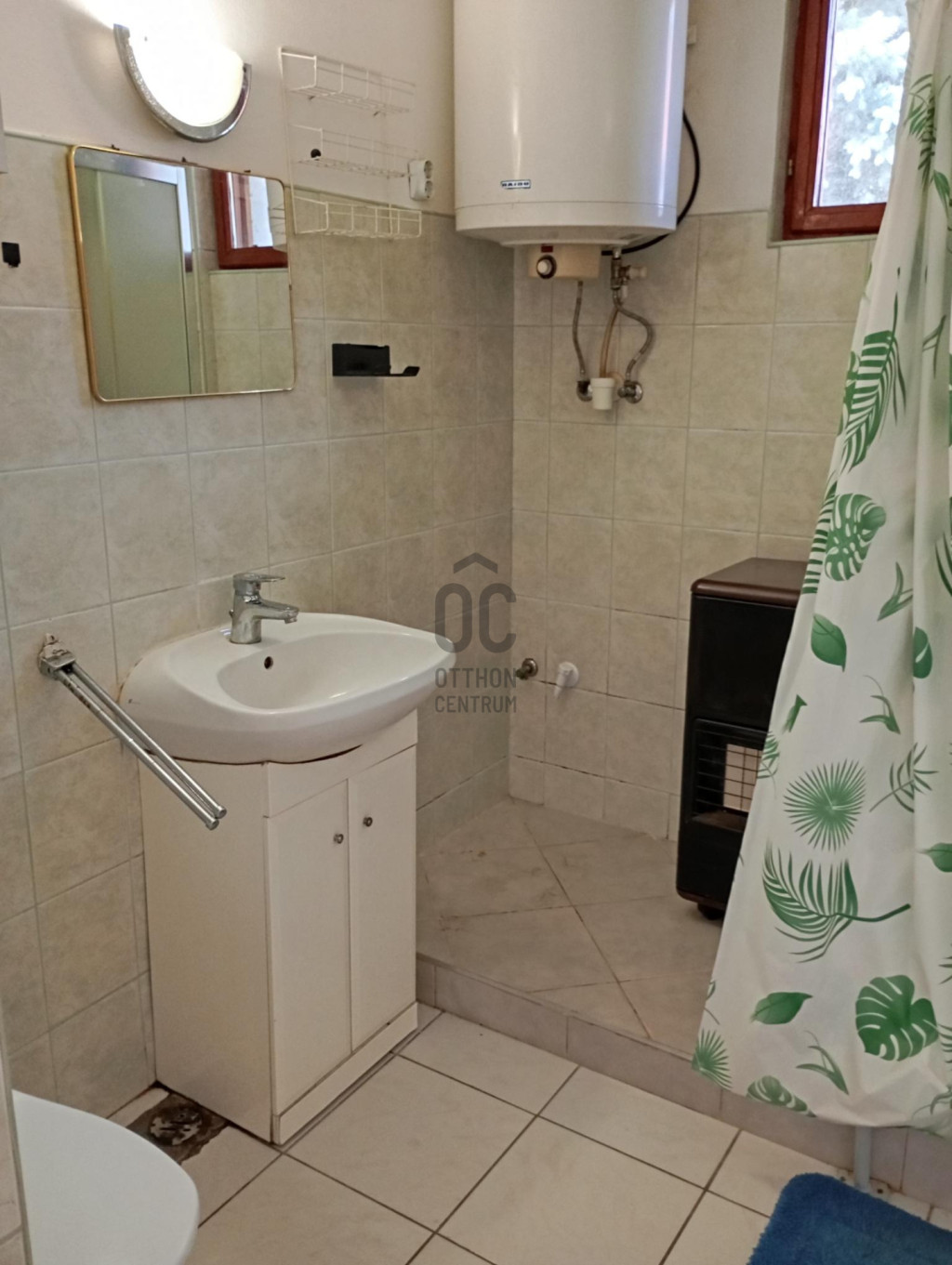 A fürdőszoba egybenyitott, zuhanyzós, ami kényelmes használatot biztosít.